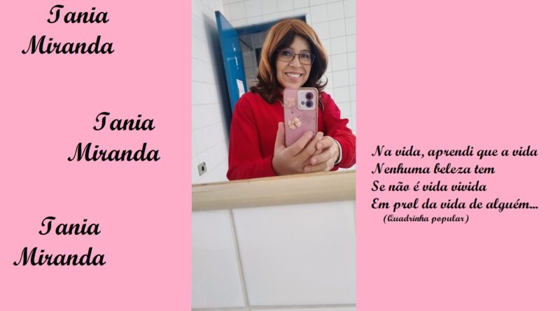 Trabalho como Agente de Organização Escolar (Secretaria de Educação do Estado de São Paulo) embora no momento esteja prestando serviço junto ao TRE, no Cartório Eleitoral como Auxiliar Requisitada. Gosto de escrever, tenho dois livros publicados, “Tirésias, a dualidade da alma humana”(autobiografia), pela Editora Verso e Prosa e “A volta do Justiceiro”, romance explorando o folclore brasileiro, publicado pela UICLAP. Publico crônicas diariamente em alguns grupos, meu perfil e meu blog… (taniamirandablog.blogspot .com)… sou casada, tenho quatro filhos e dois netos, sendo que minha neta mora comigo desde os três meses de idade…
