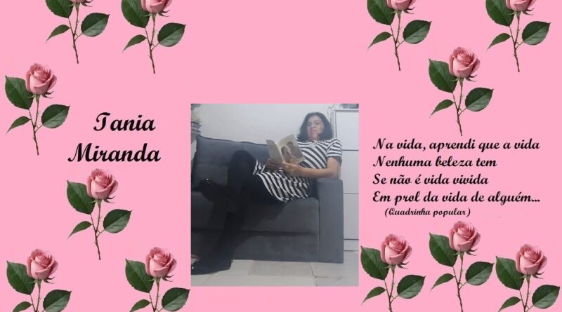 Trabalho como Agente de Organização Escolar (Secretaria de Educação do Estado de São Paulo) embora no momento esteja prestando serviço junto ao TRE, no Cartório Eleitoral como Auxiliar Requisitada. Gosto de escrever, tenho dois livros publicados, “Tirésias, a dualidade da alma humana”(autobiografia), pela Editora Verso e Prosa e “A volta do Justiceiro”, romance explorando o folclore brasileiro, publicado pela UICLAP. Publico crônicas diariamente em alguns grupos, meu perfil e meu blog… (taniamirandablog.blogspot .com)… sou casada, tenho quatro filhos e dois netos, sendo que minha neta mora comigo desde os três meses de idade…