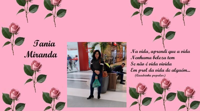 Trabalho como Agente de Organização Escolar (Secretaria de Educação do Estado de São Paulo) embora no momento esteja prestando serviço junto ao TRE, no Cartório Eleitoral como Auxiliar Requisitada. Gosto de escrever, tenho dois livros publicados, “Tirésias, a dualidade da alma humana”(autobiografia), pela Editora Verso e Prosa e “A volta do Justiceiro”, romance explorando o folclore brasileiro, publicado pela UICLAP. Publico crônicas diariamente em alguns grupos, meu perfil e meu blog… (taniamirandablog.blogspot .com)… sou casada, tenho quatro filhos e dois netos, sendo que minha neta mora comigo desde os três meses de idade…