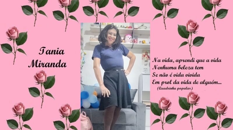 Trabalho como Agente de Organização Escolar (Secretaria de Educação do Estado de São Paulo) embora no momento esteja prestando serviço junto ao TRE, no Cartório Eleitoral como Auxiliar Requisitada. Gosto de escrever, tenho dois livros publicados, “Tirésias, a dualidade da alma humana”(autobiografia), pela Editora Verso e Prosa e “A volta do Justiceiro”, romance explorando o folclore brasileiro, publicado pela UICLAP. Publico crônicas diariamente em alguns grupos, meu perfil e meu blog… (taniamirandablog.blogspot .com)… sou casada, tenho quatro filhos e dois netos, sendo que minha neta mora comigo desde os três meses de idade…