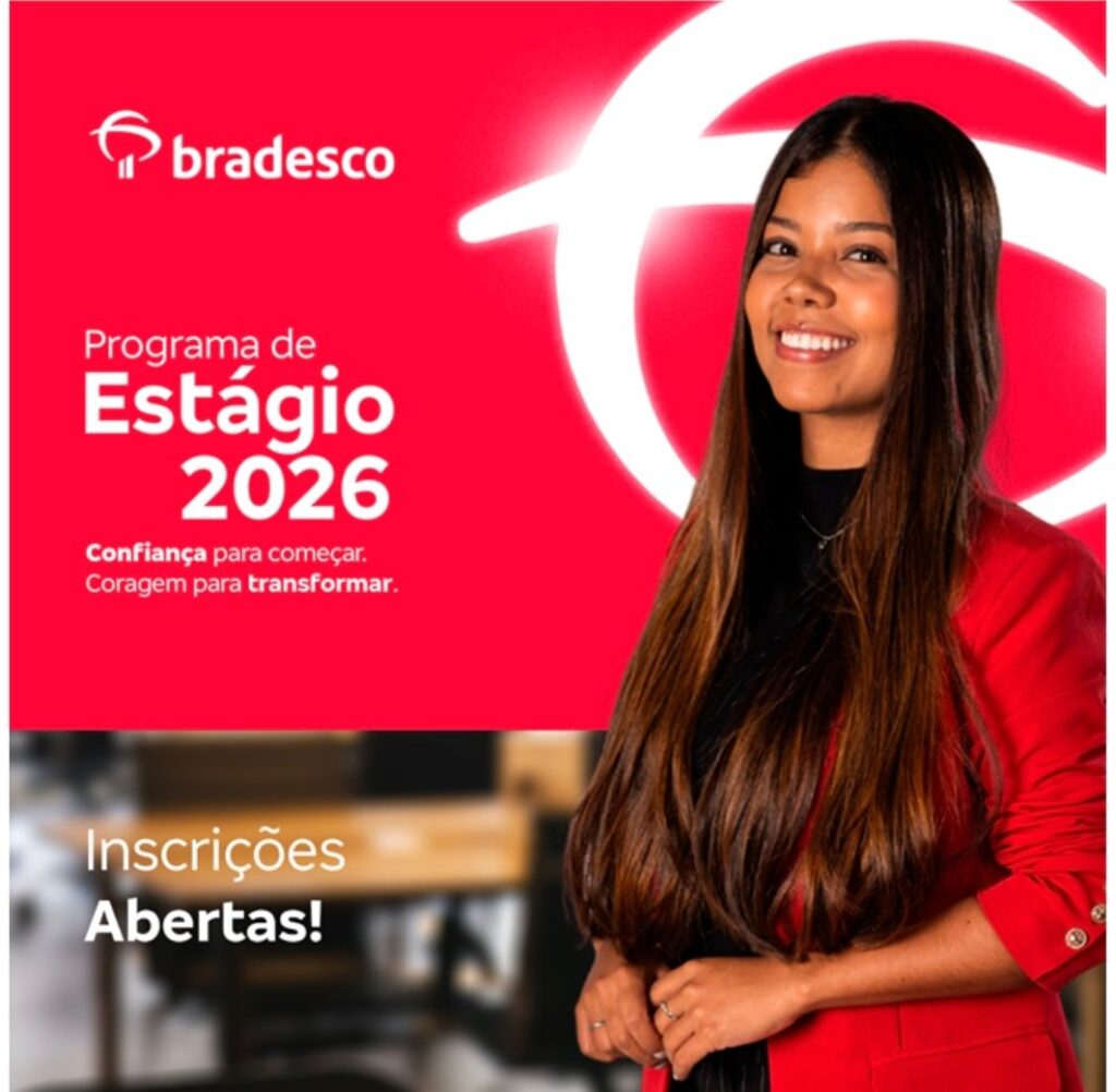 O Bradesco anuncia a abertura de inscrições para o Programa de Estágio 2026, voltado a estudantes que desejam iniciar sua trajetória em um ambiente colaborativo, acolhedor e orientado ao aprendizado contínuo. Guiado pelo mote ‘Confiança para começar. Coragem para transformar’, o programa convida universitários de todo o país a darem o primeiro passo na carreira com suporte estruturado, vivências práticas e oportunidades reais de evolução em diferentes frentes do negócio. As inscrições estão abertas até 7 de abril, pelo link Bradesco – Programa de Estágio 2026.